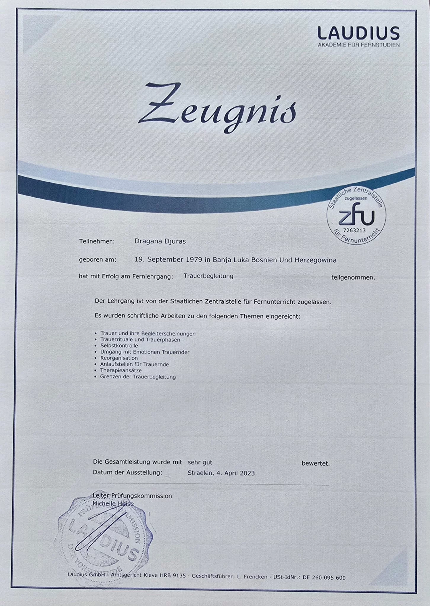 Als zertifizierte Trauerberaterin begleite ich Sie an Ihrer Seite durch diese Phase. In der intensiven Trauer meines Lebens, nach dem Verlust meines Kindes, habe ich die Ausbildung zur Trauerbegleiterin gemacht. Gerne unterstütze ich Sie mit meiner einfühlsamen, ruhigen und ermutigenden Präsenz und reiche Ihnen die Hand, damit Sie wieder aufstehen können.
